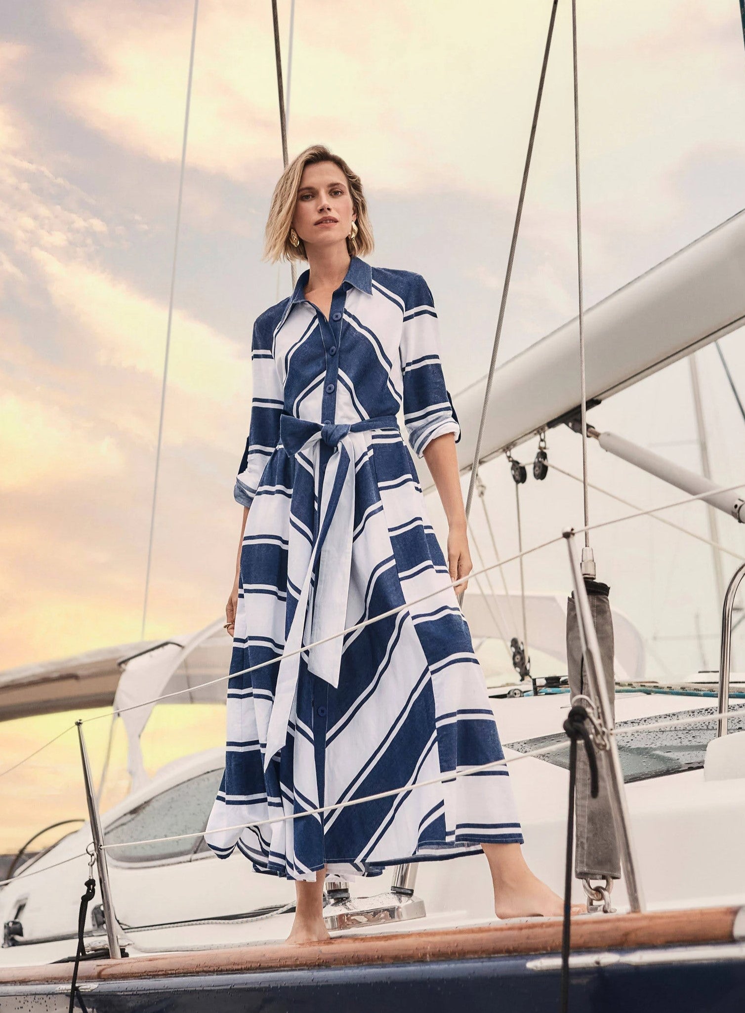 Cotton Stripe Print Fit and Flare Shirt Dress