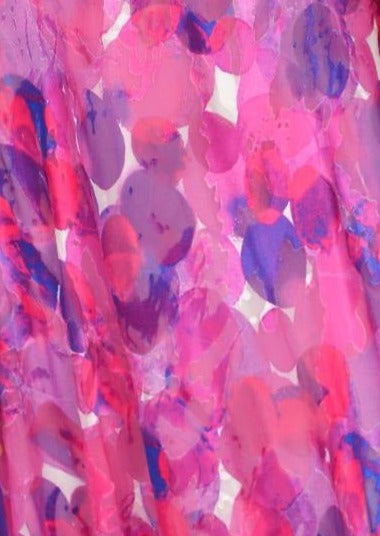Made from luxurious silk, this dress features a classic round neck and short sleeves in a bold and stunning Fuchsia and purple print as per picture. The tiered detailing adds depth and texture to the dress, while the comfortable and flowy fit ensures that you'll feel confident and stylish all day long.