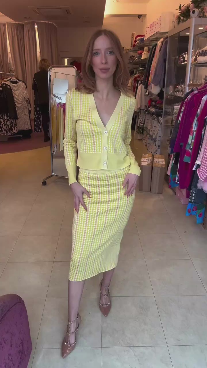 Pure sunshine. This skirt features a colourful checked pattern made from natural fibres - a viscose and cotton blend. Its figure-hugging silhouette comes in a midi length and is slit at the side. Pair it with the golden-yellow coordinating cardigan .