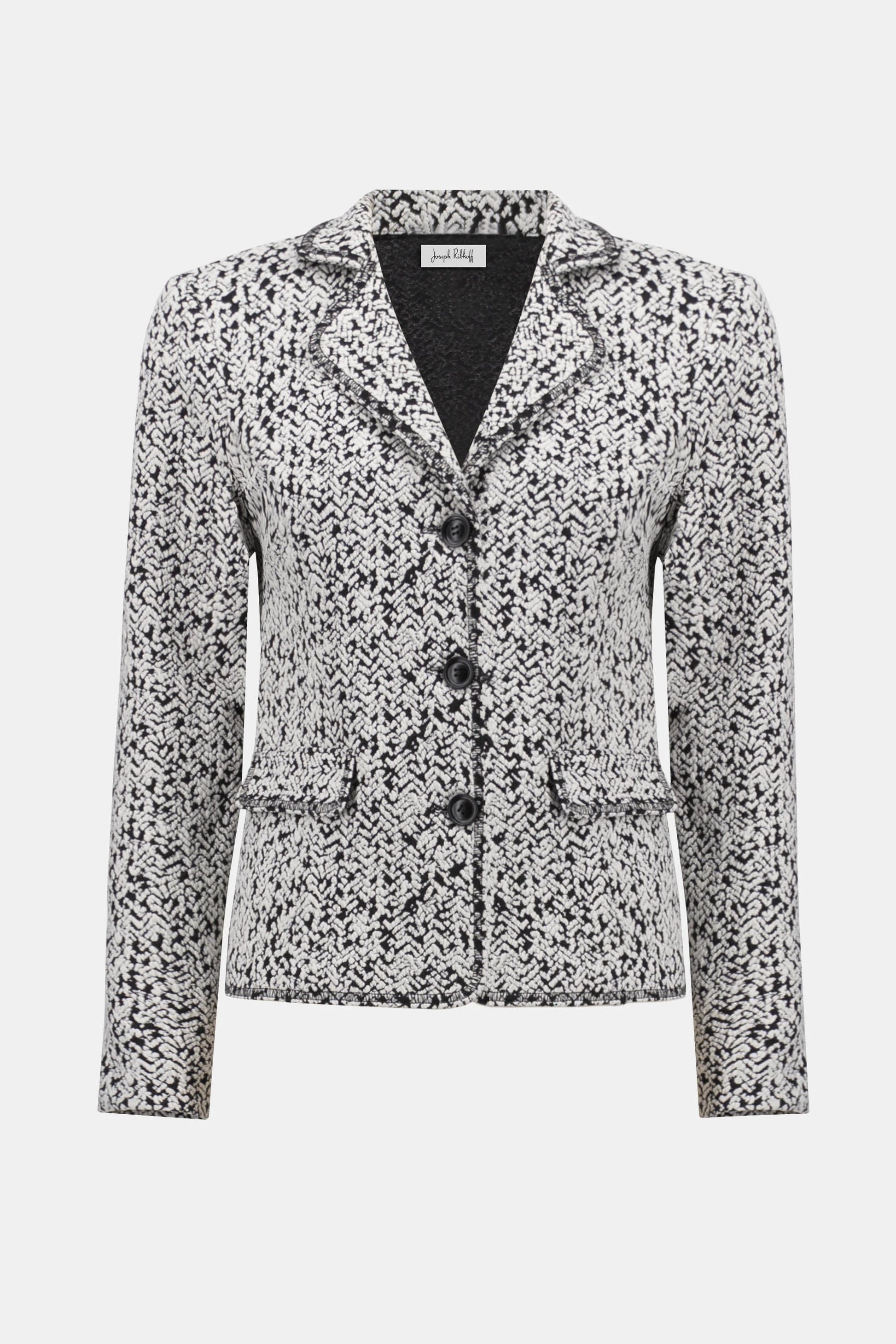 Add a modern twist to your classic wardrobe staples with this Abstract Jacquard Blazer by Joseph Ribkoff. Designed in a refined black-and-white cotton-blend knit, this blazer showcases an all-over abstract jacquard pattern that instantly elevates any outfit.