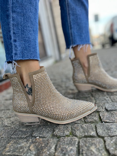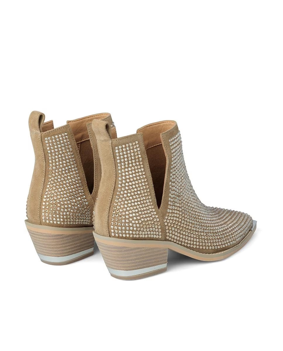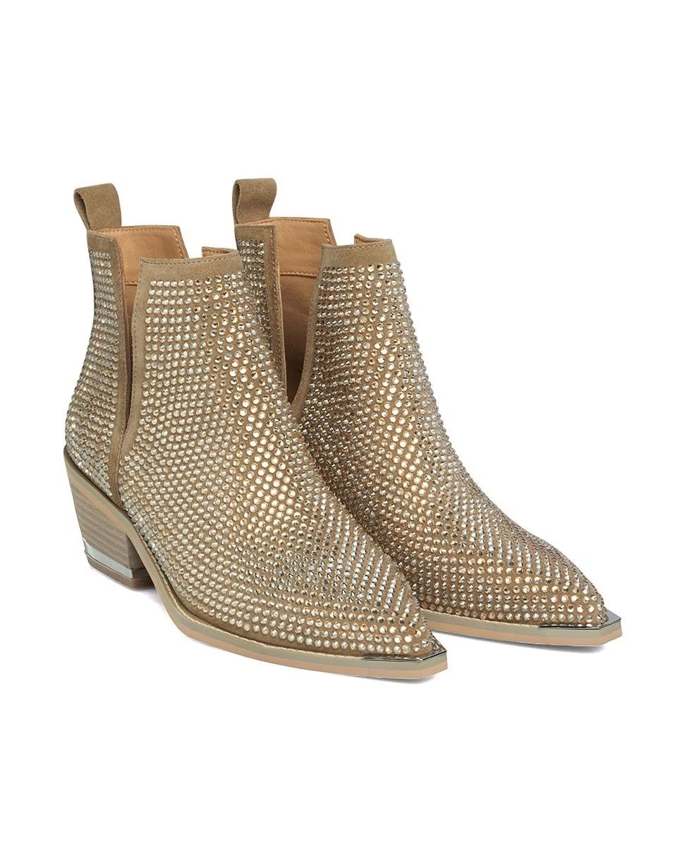 All leather ankle boot covered with rhinestones. They have very practical stacked heels with wooden details and ornate pointed toe cap. The v-cut at ankle height not only makes them comfortable but also creates a very stylish effect.