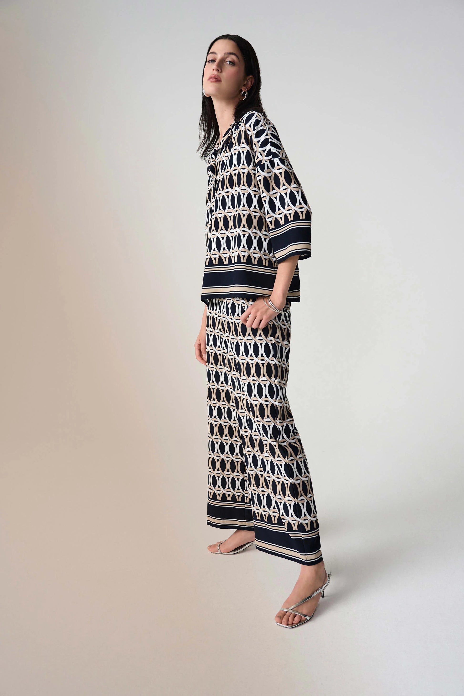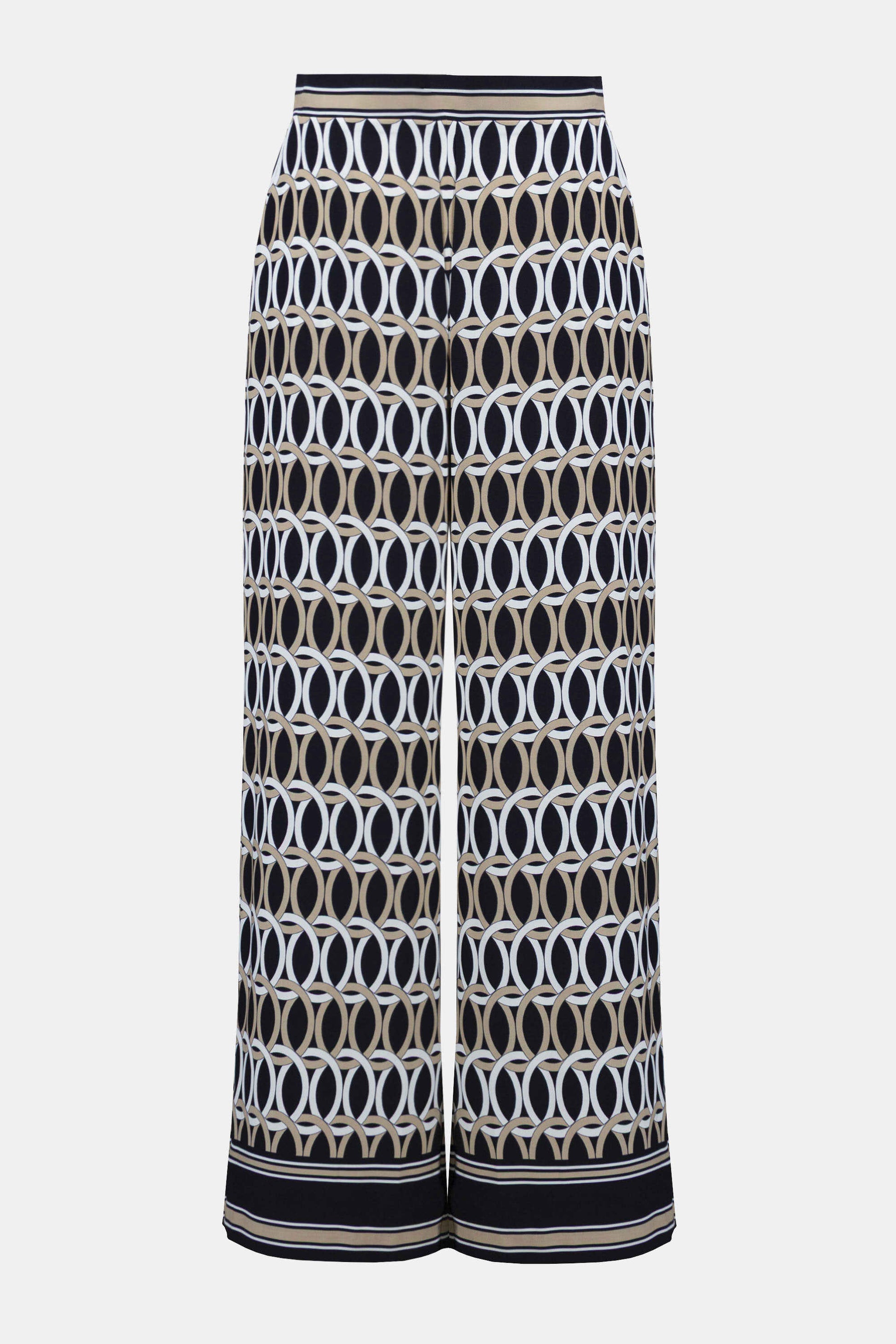 Sophisticated with a statement edge, these recycled woven trousers by Joseph Ribkoff feature a bold status chain border print, side pockets, and a comfortable shirred elastic waistband at the back.