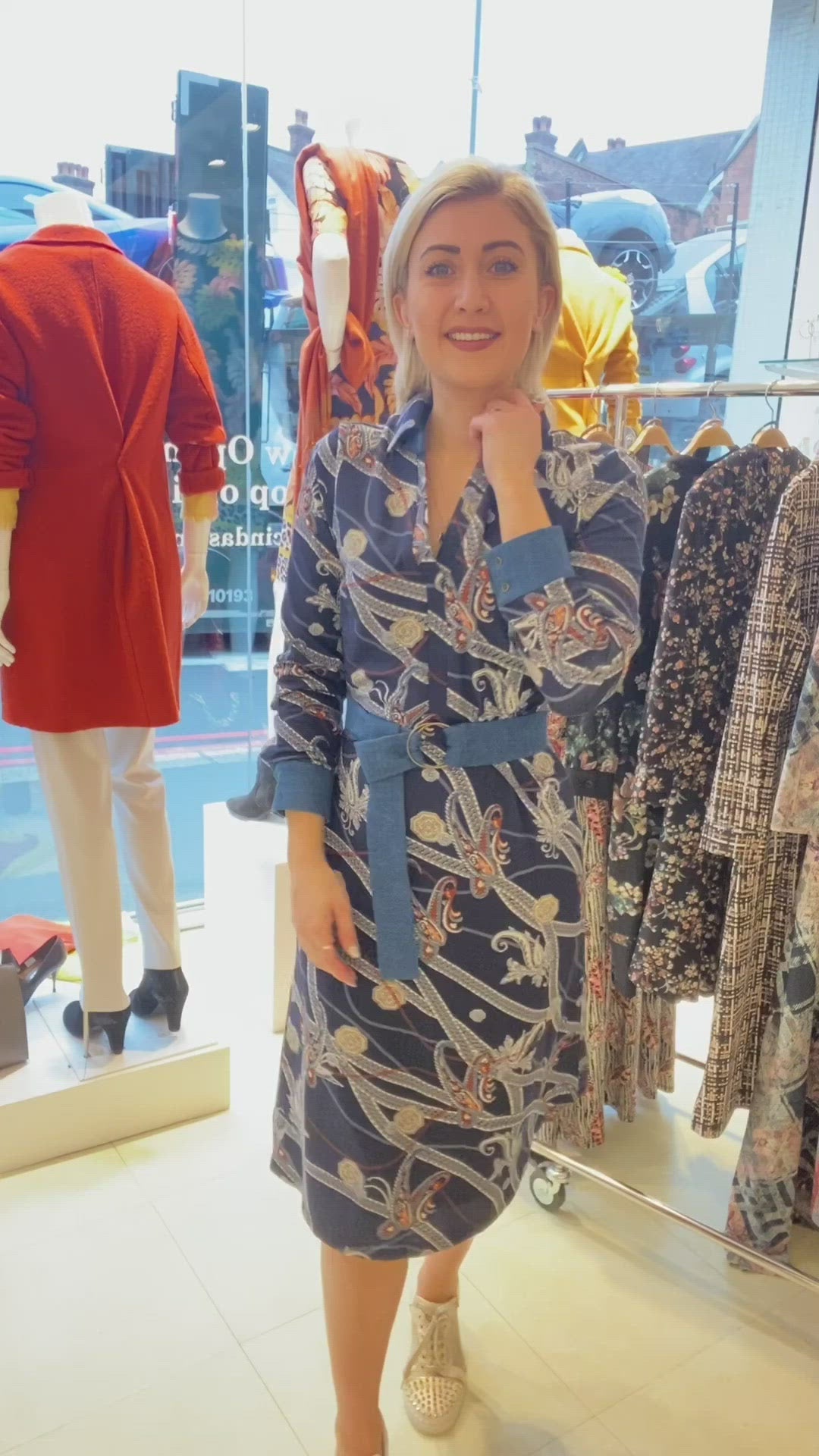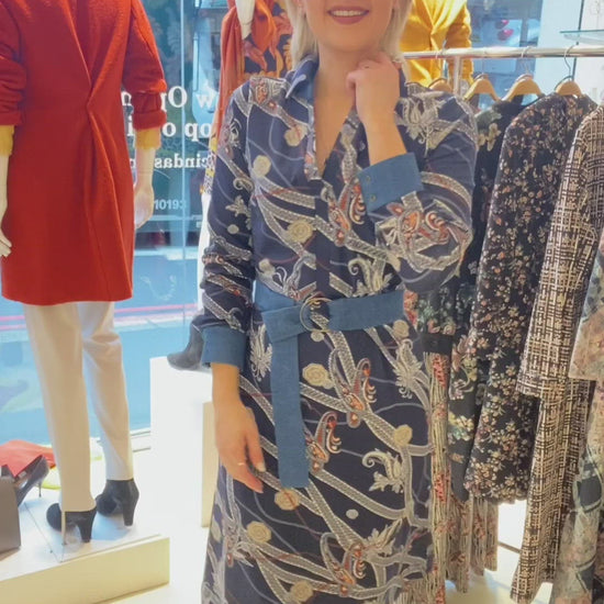 This chain print design midi dress in fine knit with contrasting denim belt and cuffs has a light stretch, is comfortable to wear and feels soft. It features long sleeves, a spread collar with buttons and a belt at the waist to accentuate your feminine curves.