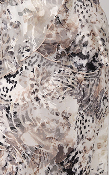 Midi length silk patterned skirt and top set, bias cut with floaty layers and elbow length sleeves.