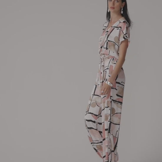 A Joseph Ribkoff bold abstract print brings edge to this recycled hammered satin top. The shirt collar and V-neckline offer a polished contrast to the relaxed boxy shape, finished with short dolman sleeves and a front pleat.
