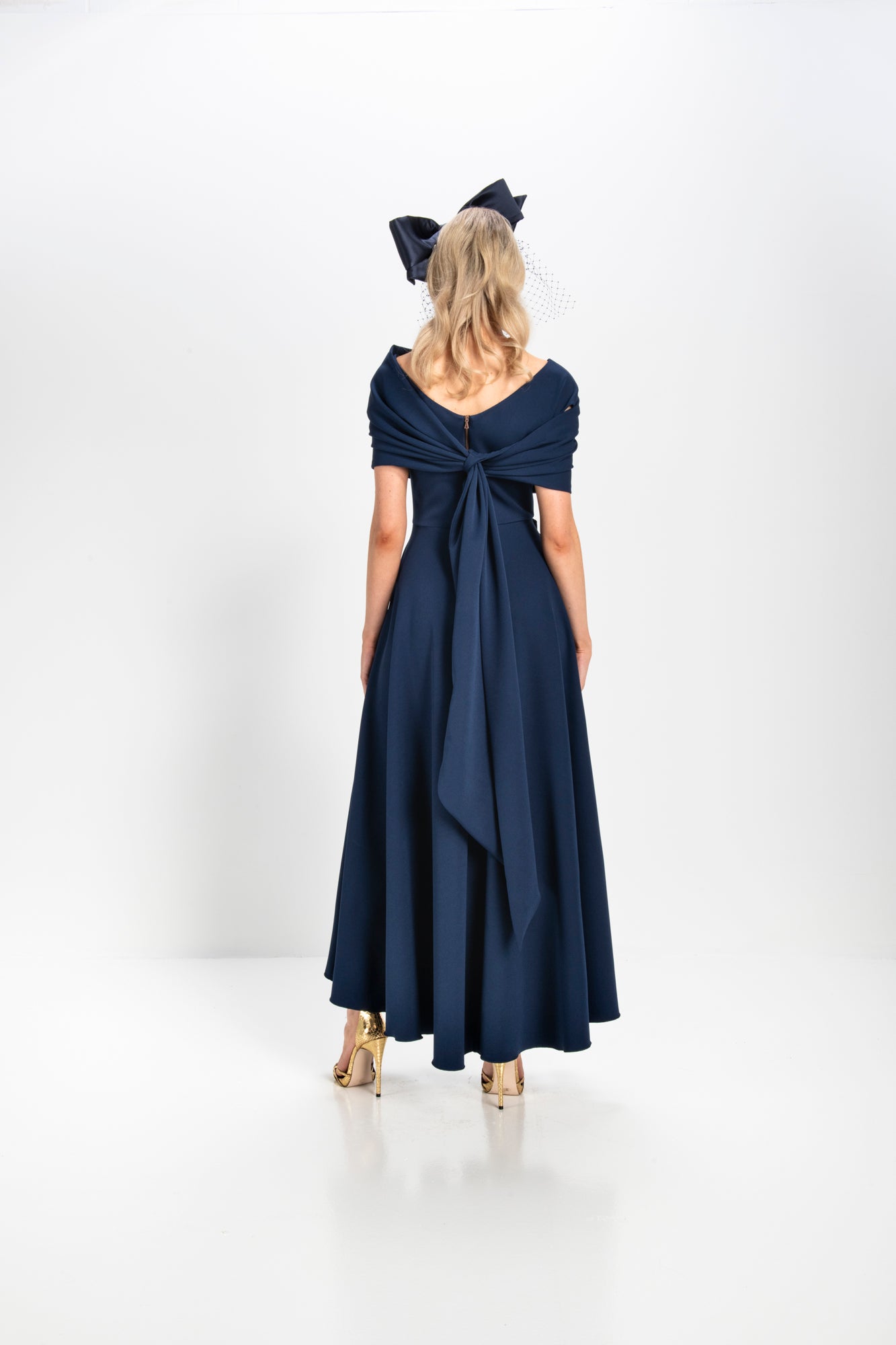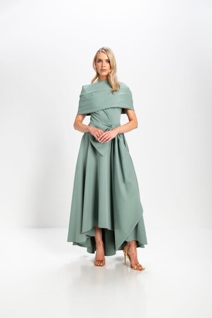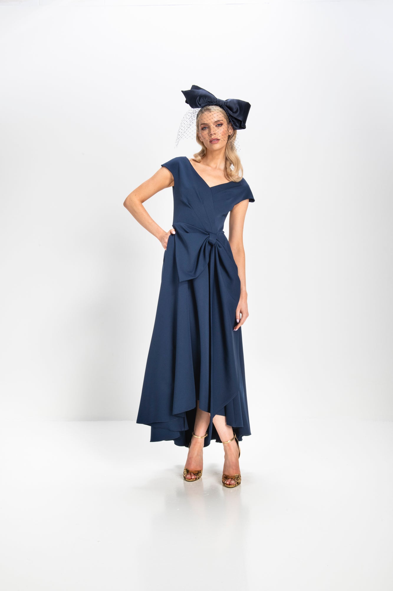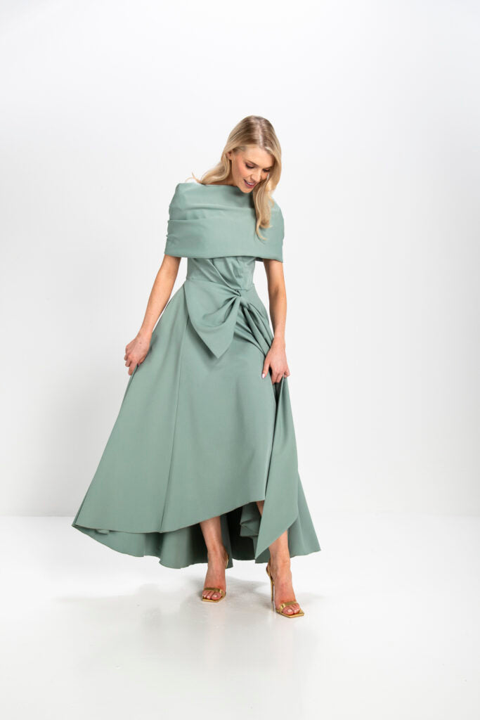 Made from a heavy stretch fabric, this dress features a flattering V neck with stitching detail, a charming draped bow, and a full skirt with a dramatic dipped hemline. The fitted bodice is adorned with delicate pleated detailing, accentuating the waist with a large, elegant bow that adds a touch of charm.