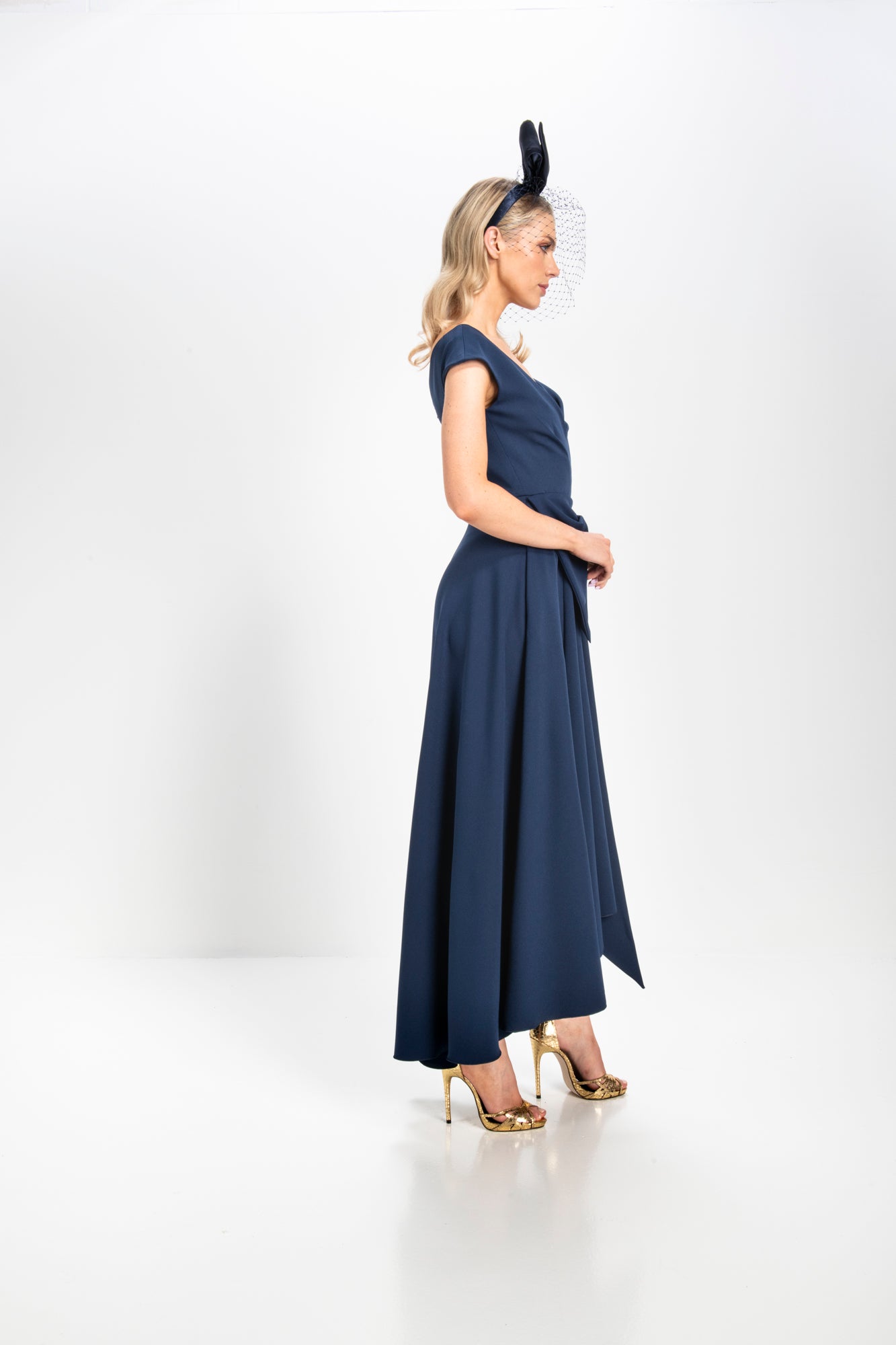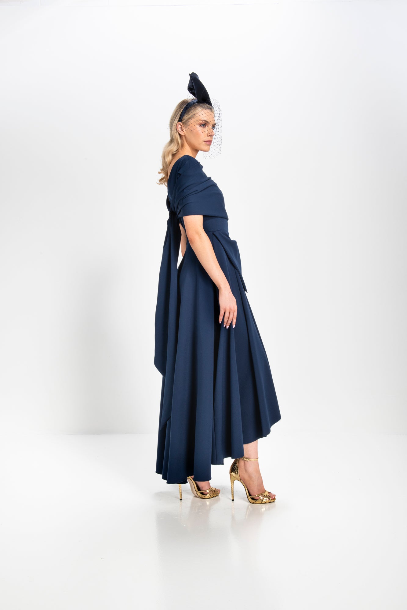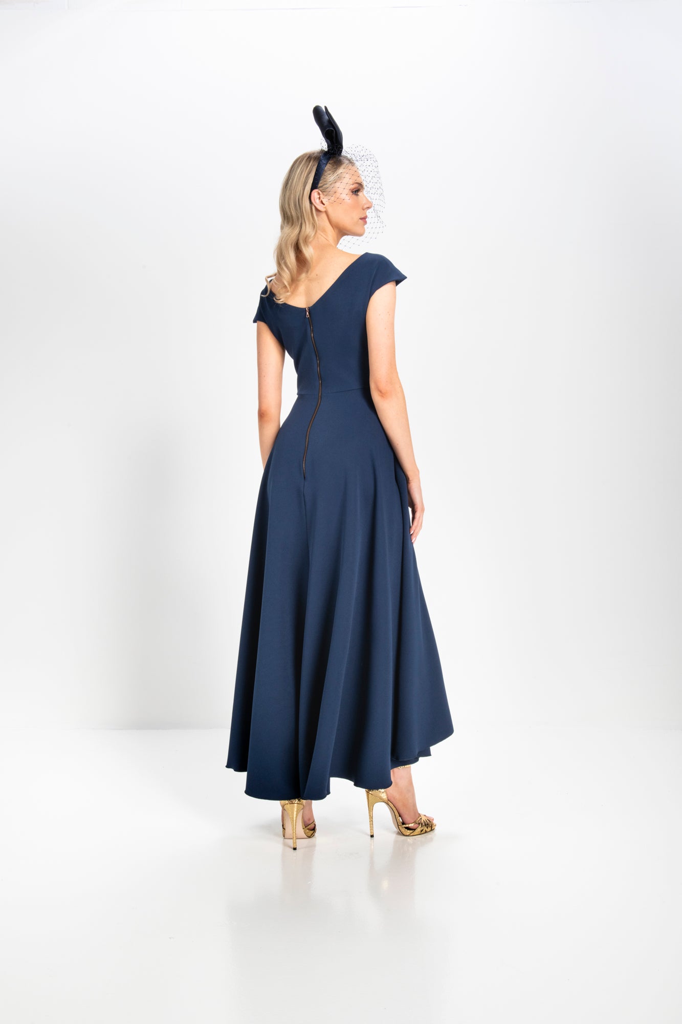 Made from a heavy stretch fabric, this dress features a flattering V neck with stitching detail, a charming draped bow, and a full skirt with a dramatic dipped hemline. The fitted bodice is adorned with delicate pleated detailing, accentuating the waist with a large, elegant bow that adds a touch of charm.
