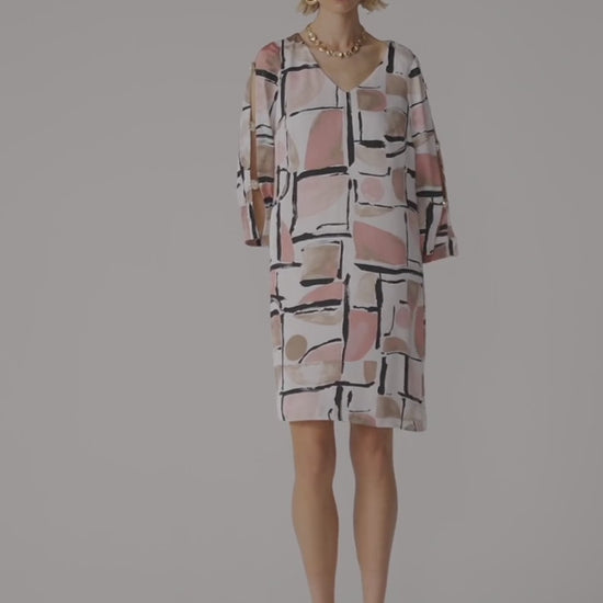 Swirls of abstract print ripple across this recycled satin dress. A V-neckline opens into a trapeze silhouette, framed by three-quarter sleeves with dramatic slits and shimmering gold ornament details..