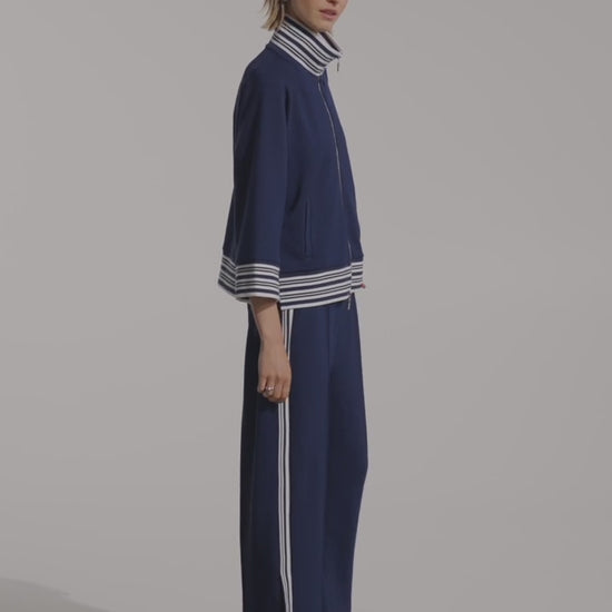 A sporty twist on a soft culotte shape, these scuba jersey trousers by Joseph Ribkoff feature side stripe rib trim and clean welt-style details. The elastic waistband with gentle shirring keeps the fit relaxed yet refined.