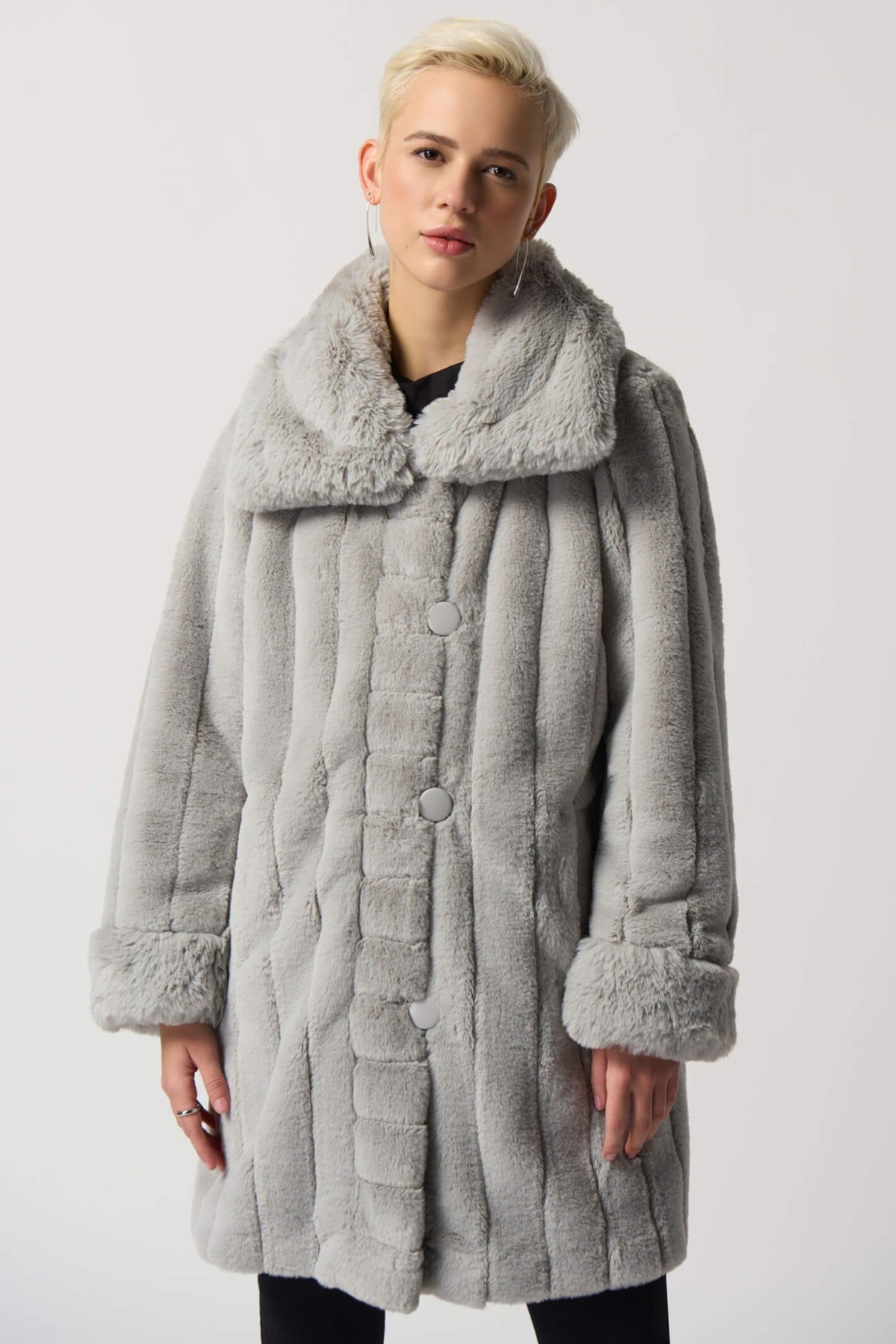 This Joseph Ribkoff 2-in-1 reversible faux fur coat is the perfect blend of luxury and comfort. It features long straight puff sleeves and collar, giving it a vintage charm. Plus, it's lightweight and warm, making it perfect for those cold winter days.