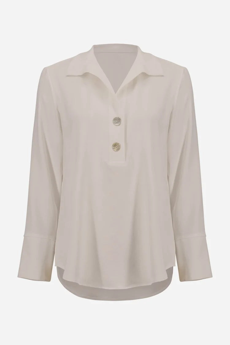 The piece is tailored in a polished straight silhouette with a sleek shirt collar and front buttons, a classic, yet versatile look that can effortlessly transition from morning meetings to evening cocktails. The three-quarter sleeves with folded cuffs add character to this modern-style staple.