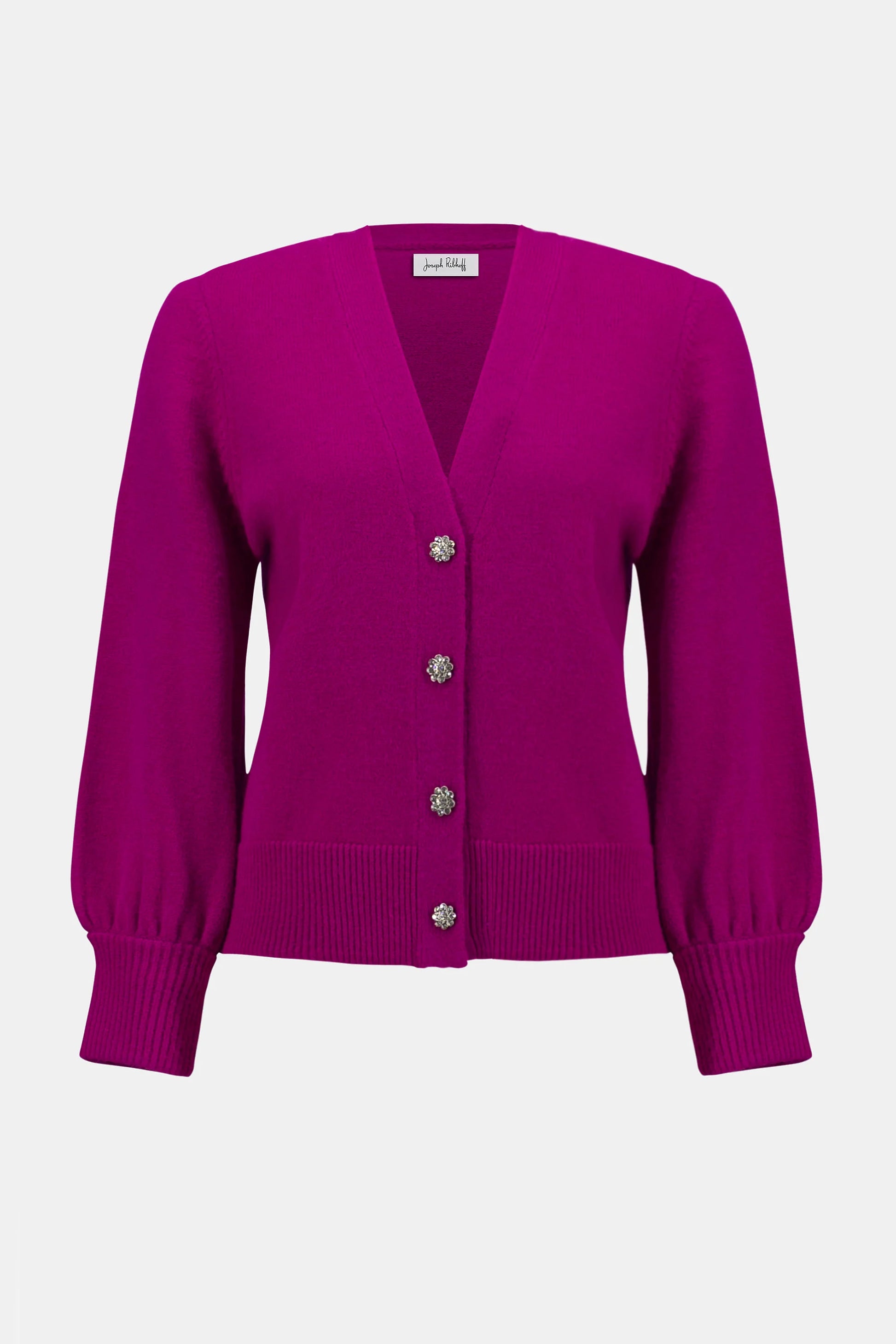 Elevate your layering game with this chic cardigan by Joseph Ribkoff, featuring a flattering V-neckline, long puff sleeves, and dazzling rhinestone buttons for a touch of glamour.