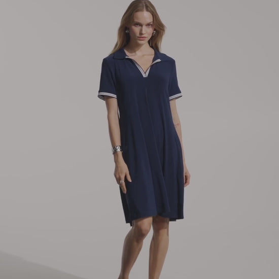 This silky knit trapeze dress from Joseph Ribkoff, is a perfect blend of refinement and comfort, with its ribbed polo collar and short sleeves. Inseam pockets keep things practical, while the flowy shape adds a modern edge.