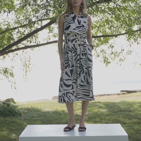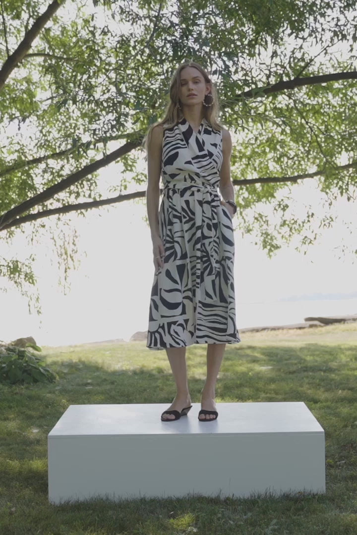 A wrap neckline highlights this gauze fit-and-flare dress by Joseph Ribkoff, patterned with a tropical print for a light, breezy look. The sleeveless design and waist sash shape the silhouette, finished with a side zipper for a clean closure.